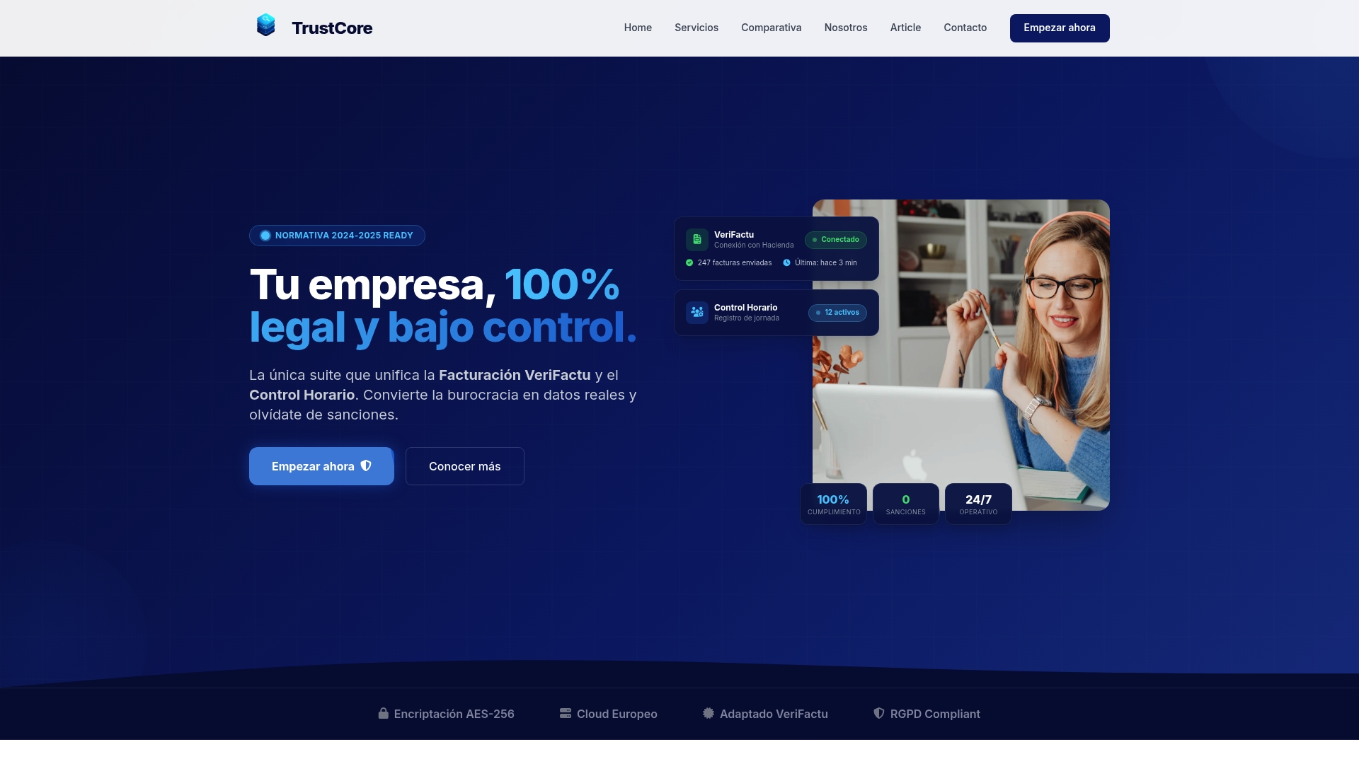 En TrustCore ofrecemos un entorno digital diseñado para que pymes y medianas empresas gestionen todos sus procesos desde un único punto de control. Facturación, control horario, compras, cumplimiento normativo y reporting integrados en una sola plataforma. Sin duplicidades, sin fricciones, sin datos dispersos. Nuestras soluciones de gestión centralizada se adaptan al tamaño y la madurez de tu empresa, con implantación guiada y soporte continuo. Descubre todas las ventajas con TrustCore y da el siguiente paso con el respaldo de un equipo que conoce los retos reales de las pymes españolas. Contacta con nosotros y te ayudamos a diseñar tu plan de centralización.